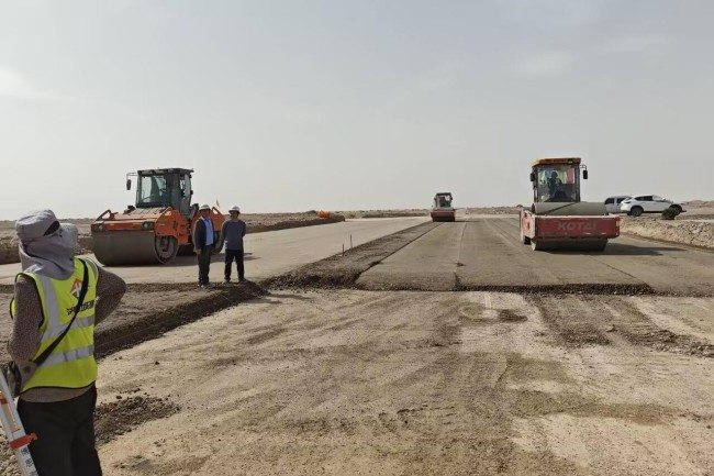 項目團隊在施工過(guò)程中克服了地域差異和風(fēng)沙大等惡劣自然環(huán)境,科學(xué)統籌、加強調度,與各個(gè)施工班組緊密聯(lián)動(dòng),高效完成各項施工任務(wù)。通過(guò)“人力動(dòng)態(tài)調配+物資智能儲備”優(yōu)化資源配置,高強度高質(zhì)量高效能施工,施工高峰期時(shí)300輛水穩運輸車(chē)同時(shí)作業(yè)。嚴格落實(shí)集團標準化管理,提前完成路床換填,盡顯項目團隊專(zhuān)業(yè)攻堅能力。項目施工遇沙塵暴天氣,項目部全體建設者主動(dòng)加壓提速,每周進(jìn)度碰頭會(huì )實(shí)時(shí)監控進(jìn)展,發(fā)現偏差及時(shí)糾偏,確保各項關(guān)鍵節點(diǎn)高質(zhì)高效完成。